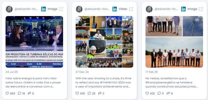 Eduardo is a natural partner for major media outlets and energy stakeholders. He has appeared in interviews on CNN and CNBC, representing the energy transition movement and showcasing Vestas’s strategic role in Latin America. Internally, his posts highlight large-scale team initiatives and industry collaboration. His partnership with Casa dos Ventos is a key example of delivering large energy infrastructure projects. His presence at public events and in executive media interviews keeps his message clear, consistent, and credible.