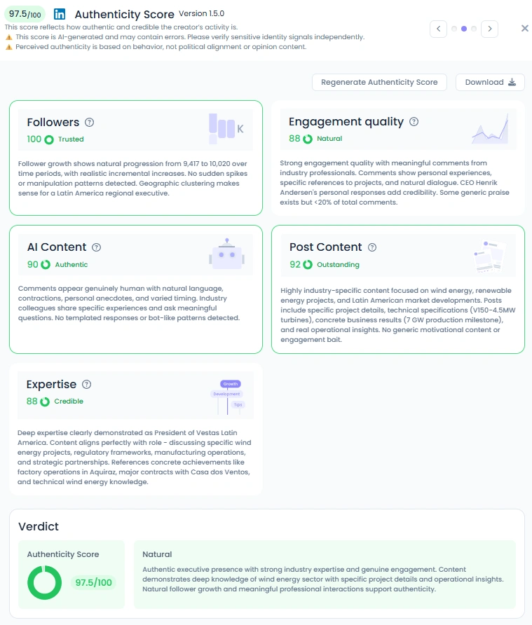 Eduardo scores a stellar 97.5/100 on his LinkedIn Authenticity Score. His audience growth is completely organic, increasing from 9,417 to over 10,000 followers in a stable and healthy way. His posts are filled with comments from fellow executives, engineers, and energy professionals who ask questions, share stories, and engage in meaningful ways. His AI content score is 90, meaning it’s clear he’s writing from experience, not from templates. With a post content quality score of 92, his updates often include highly specific project information, like turbine models and site development insights, with no fluff in sight.
