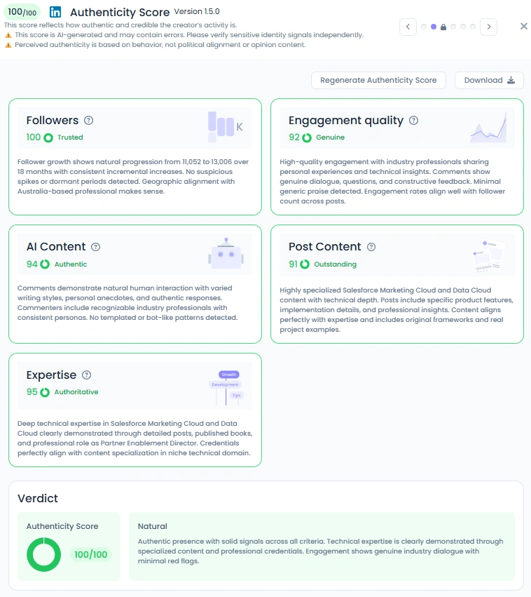 Favikon rates Eliot 100 out of 100 for authenticity. His feed includes book announcements, snapshots from events, demo videos, and first-hand project insights. Comments show technical follow-ups and peer troubleshooting, not generic praise. That clear, consistent pattern signals a real practitioner sharing real work.
