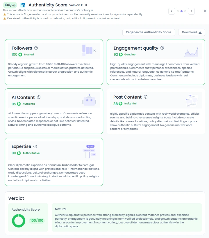 Elise’s Favikon Authenticity Score is a perfect 100/100, reflecting an unusually natural and trustworthy presence. Her feed mixes high-quality event photography, official announcements, and personal gratitude for collaborations. Commenters include verified professionals and diplomatic peers, which reinforces her credibility. The pattern of engagement reads as genuine public service rather than performative PR.