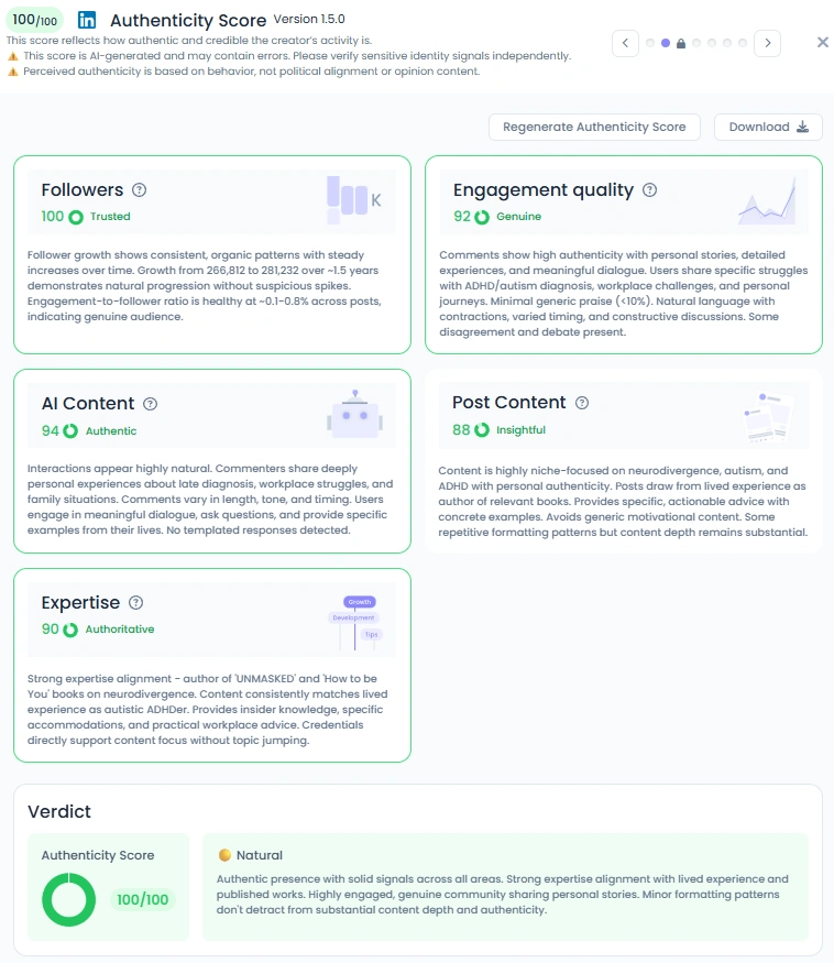 Favikon pegs her authenticity at 100/100. Comments are long, personal, and specific, with users sharing late diagnoses, workplace stories, and family life. She posts casual selfies, everyday wins, and the messy bits too. Debate shows up, but it stays constructive and grounded in experience.