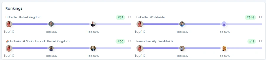 Influence score sits at 8,688 points with LinkedIn ranks in the UK top 1% and Neurodiversity worldwide at #13. Followers climbed from about 266,812 to 281,232 over roughly 18 months, with smooth, organic growth. Engagement quality scores 92, and content quality holds high across formats. Reels often land six-figure views, with standout clips crossing the million mark.