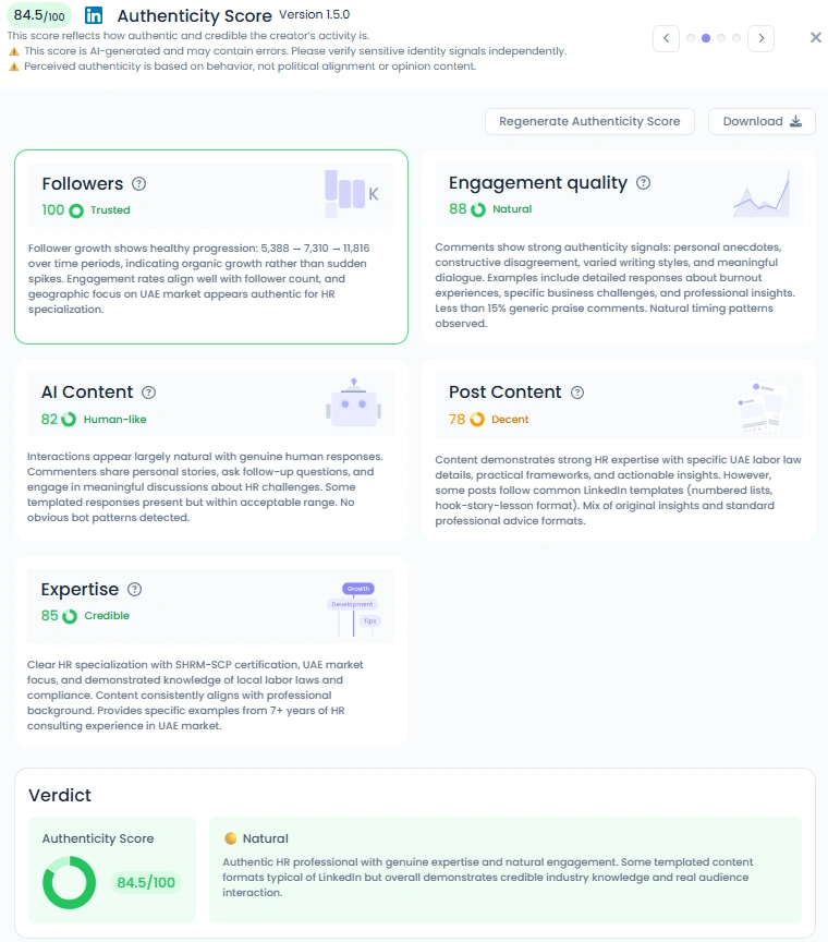 With an Favikon Authenticity Score of 84.5/100, Elrona’s content stands out for its genuine tone and clear expertise. Her posts reflect real human interaction, with audiences sharing personal experiences and thoughtful questions. The mix of compliance advice, workplace culture commentary, and myth-busting carousels shows her personal voice and depth of understanding. She stays authentic by using examples from real workplace experiences rather than recycled corporate jargon, which keeps her audience engaged and trusting.