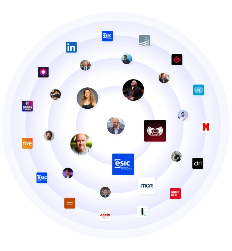 Emilio connects with industry bodies, education partners, broadcasters, and major publishers. Logos and partners around his profile include ESIC, RTVE, esports leagues and event organisers, and industry awards like Esports Awards. He engages with legal experts, studio leaders, community organisers, and institutional players, giving him a broad footprint across the business, academic, and media sides of gaming.