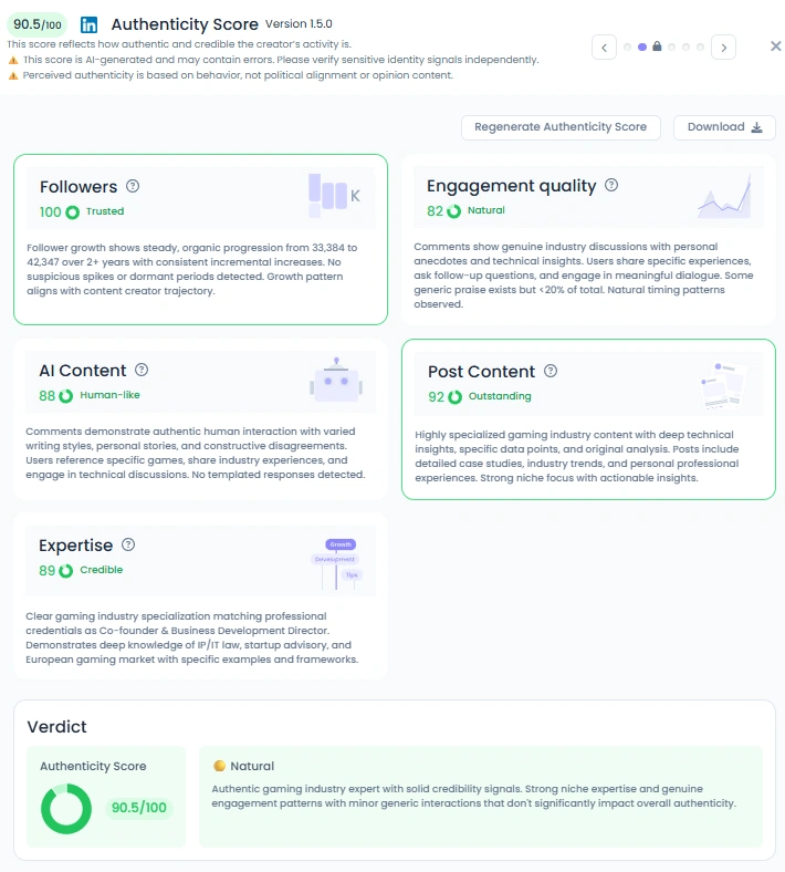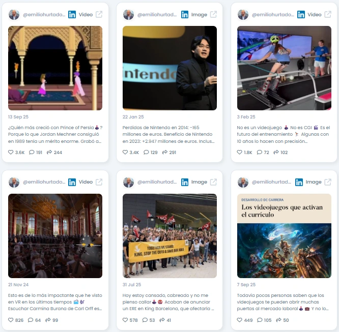 Emilio’s following grew organically from about 33,300 to 42,300 over two years, reflecting steady audience interest. His Influence Score sits around 7,639 points, and he ranks highly on LinkedIn in Spain and in gaming verticals. Post content scores are strong, with high niche engagement and meaningful comments from professionals and community members. He posts regularly and his content consistently drives shares and replies.