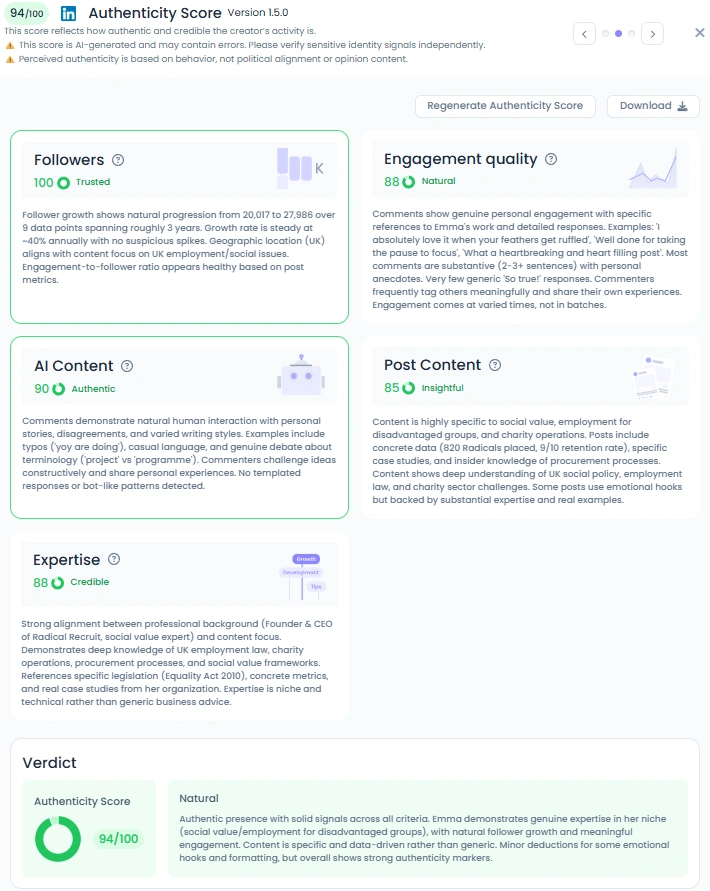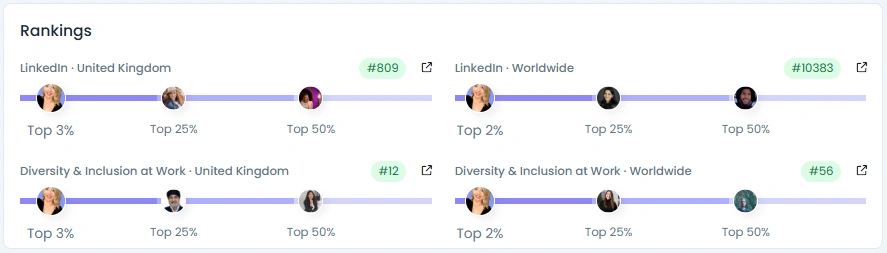 Emma has organically grown her LinkedIn following from 20,000 to nearly 28,000 over three years, maintaining a healthy 40% annual growth rate. With an Influence Score of 6,909 points, she ranks in the Top 3% of creators in the UK and the Top 2% in Diversity & Inclusion worldwide. Her posts regularly receive hundreds of reactions and genuine, story-rich comments, reinforcing her role as one of the UK’s most authentic and impactful social advocates on LinkedIn.