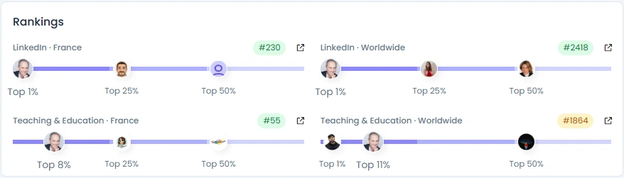 Emmanuel reaches about 31.2K followers on LinkedIn and 10.2K on X. He ranks in the Top 1% of LinkedIn creators in France with strong category placement in Teaching and Education. Activity averages 12 posts per month with good engagement and +1.13% growth. His Favikon Influence Score sits at 5 with 6,880 pts.
