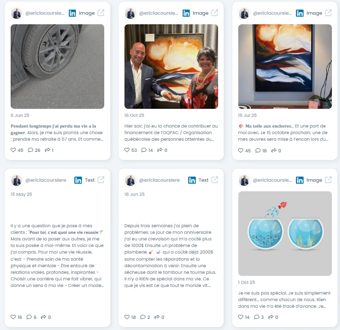 Eric Lacoursière is a Quebec financial advisor who makes money talk human. He writes in French, shares real moments, and turns lessons from life into practical guidance. His feed blends planning, philanthropy, and art. People come for the advice and stay for the perspective.