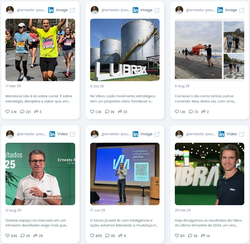 People listen to Ernesto because he makes leadership relatable. His posts often connect business strategy with personal lessons from sports, teamwork, or resilience. Whether sharing results from Vibra’s operations or reflections from a marathon, he speaks with authenticity and warmth. His tone is grounded and motivational, focused on progress rather than perfection. This mix of humility and vision keeps his audience inspired and engaged.