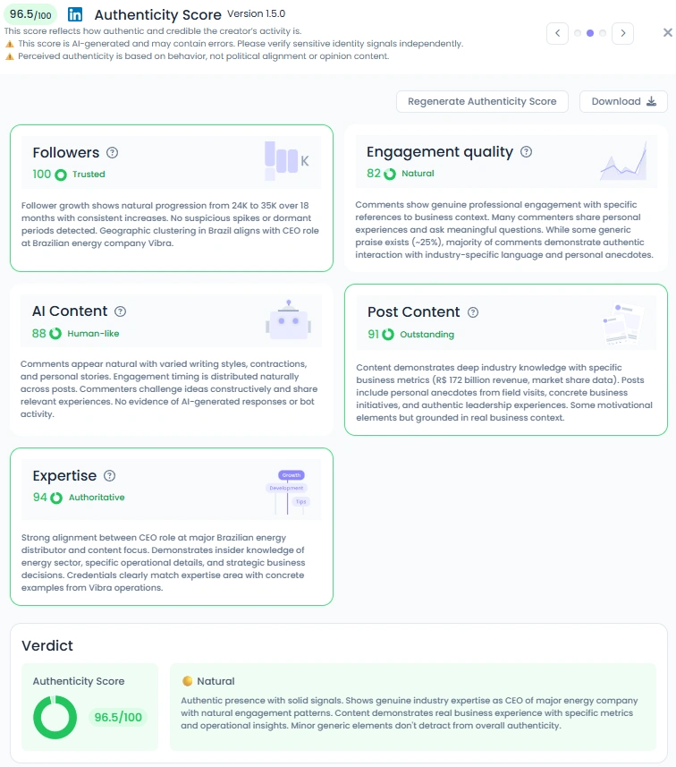 With an Favikon Authenticity Score of 96.5/100, Ernesto’s credibility speaks for itself. His follower base has grown steadily from 24K to 35K in just 18 months, showing genuine community trust. Comments on his posts are filled with professional insights, encouragement from employees, and constructive dialogue. His writing feels personal yet precise, blending corporate transparency with human emotion. Ernesto’s openness about his work, goals, and mindset makes him one of Brazil’s most authentic business voices.