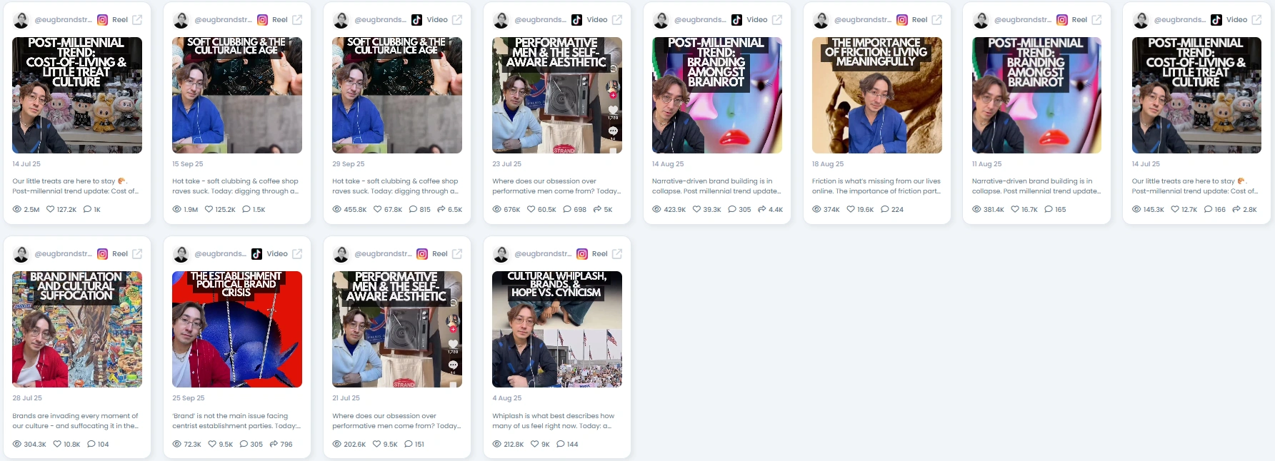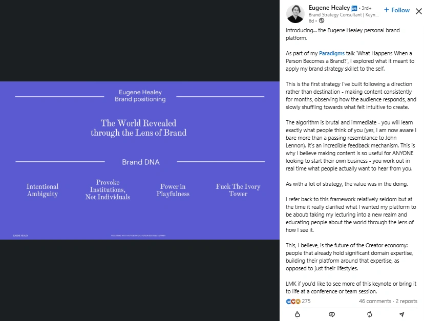 Eugene is a Melbourne-based Brand Strategy Consultant and cultural analyst. He helps companies understand how taste, platforms, and politics shape buying behavior. His work spans client consulting, keynotes, and education, supported by a research-heavy process. On social, he breaks down topics like post-millennial “little treat” culture, brand inflation, the importance of friction, and the rise of performative men. He shares frameworks from his own personal brand platform and publishes longer thinking in the “Considered Chaos” newsletter. The positioning is clear: strategy with cultural teeth.