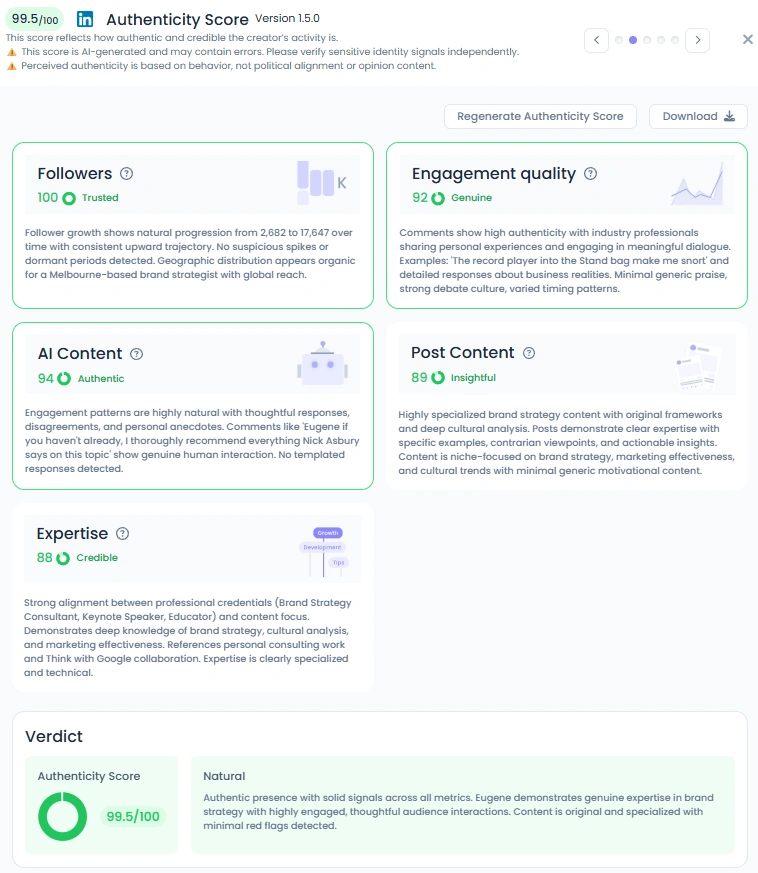 Favikon pegs his Authenticity Score at 99.5/100. Comments look like real debates between practitioners, with references, disagreements, and anecdotes. He shows the work, from slides to in-progress thinking, and reacts to feedback openly. It feels like a seminar, not a broadcast.