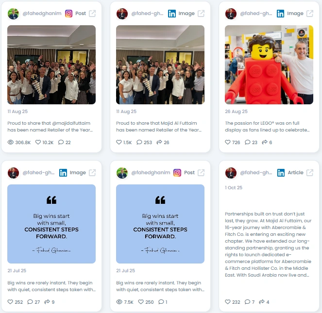 Fahed’s tone is clear and encouraging. He pairs strategy with snapshots from stores and team offsites. Posts come with one-liners you can share with your team, then back them with an example or a number. The mix of celebration and execution keeps leaders, partners, and young managers engaged.