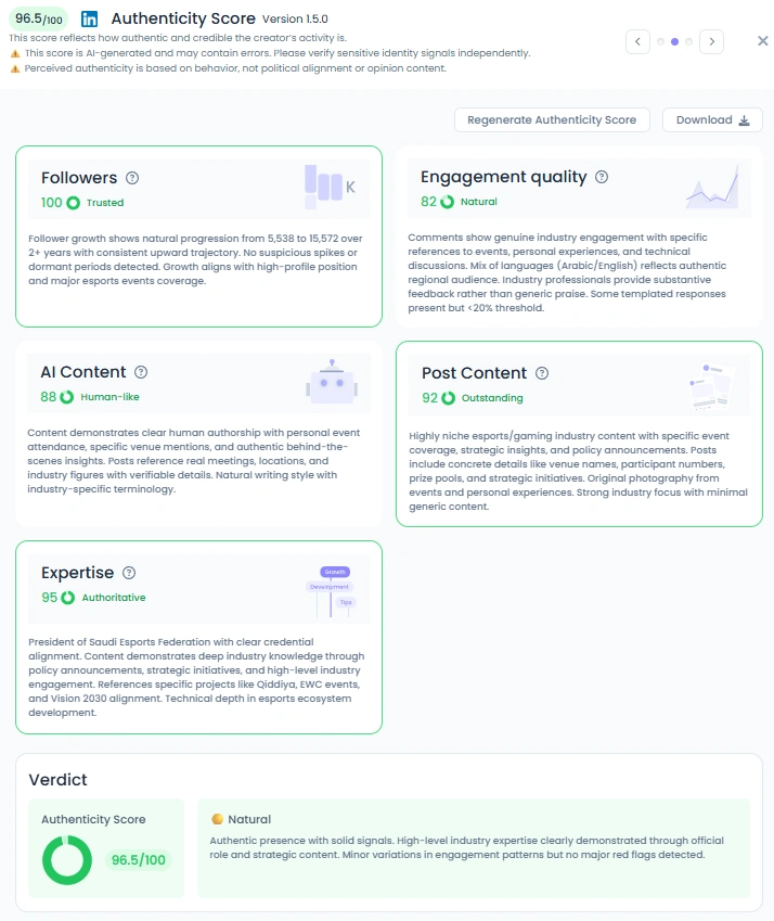 With an Authenticity Score of 96.5/100, Prince Faisal’s presence stands out as deeply credible. His posts reflect lived experiences, real events, strategic meetings, and genuine excitement from the esports arena. He balances official updates with approachable storytelling, often sharing behind-the-scenes photos and team highlights. The human tone and consistency of his content prove his role isn’t just administrative; it’s visionary leadership in motion.