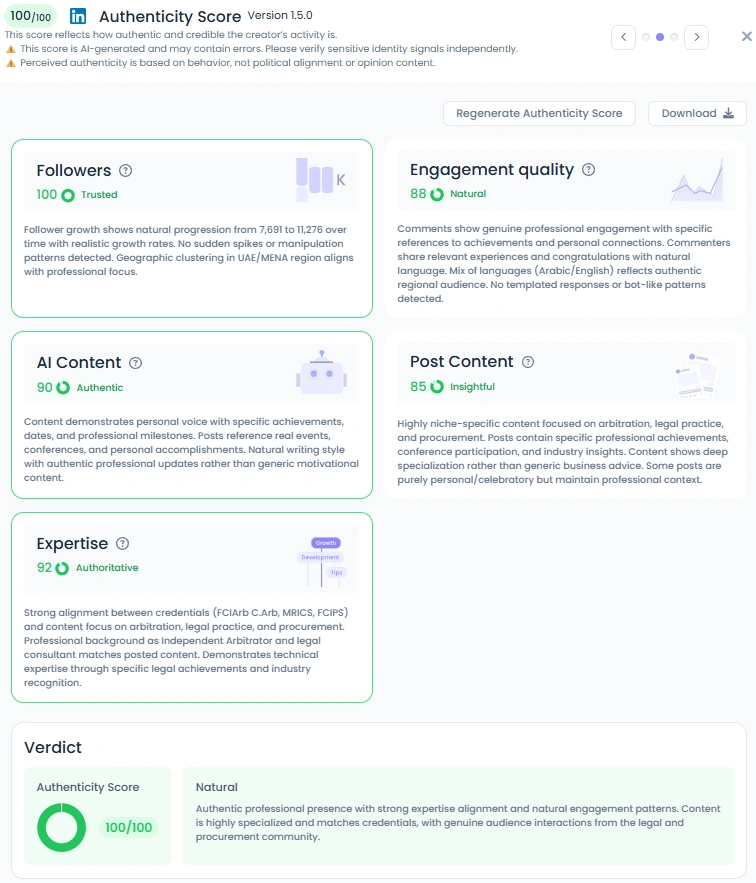 With a 100/100 Authenticity Score, Fatima’s online presence feels fully genuine. Her posts reference real events, case participation, professional milestones, and recognitions that match her background. Engagement is natural and personal, with comments from colleagues congratulating her, recalling shared experiences, or adding context. She writes in her own voice, alternating between English and Arabic depending on the audience. No suspicious patterns, AI-generated phrasing, or inflated reactions appear in her activity. What she shares reflects exactly who she is offline.