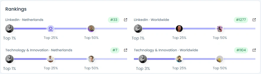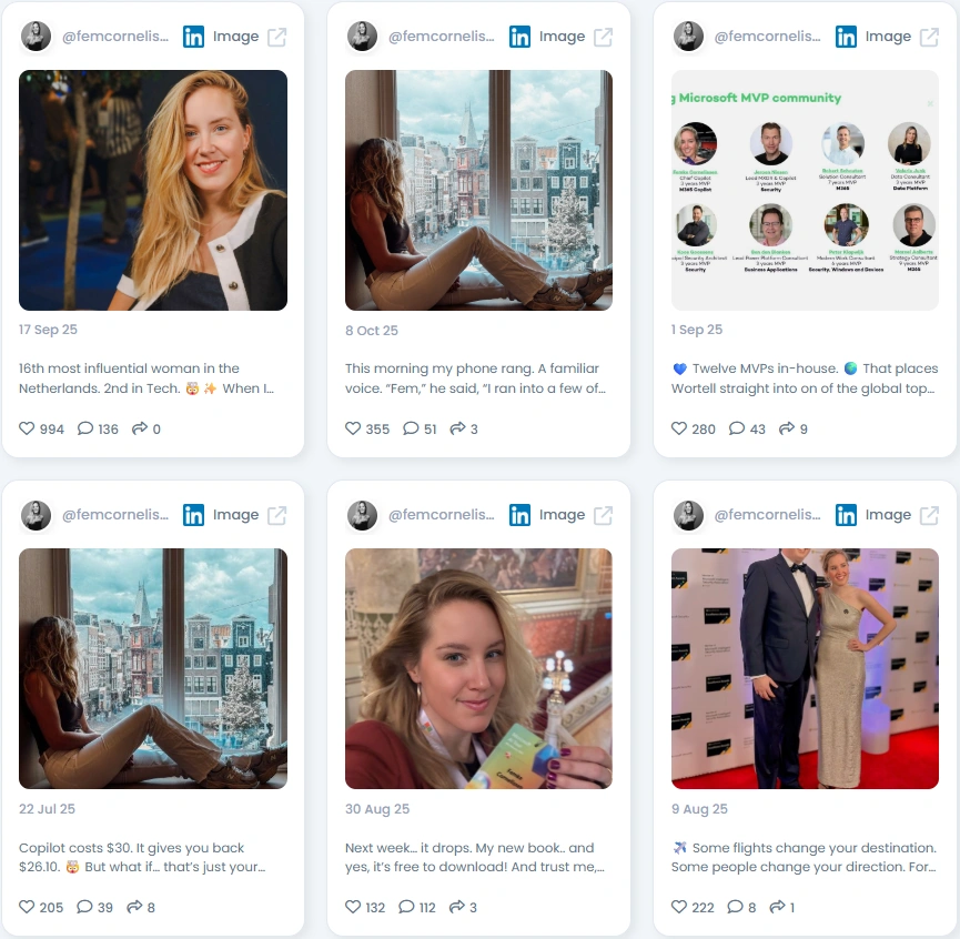Femke’s LinkedIn following has grown from 7K to over 23K in just three years, supported by steady engagement and consistent content. Her Influence Score of 7,219 points places her among the top 1% of creators in the Netherlands and the top 3% globally in Technology & Innovation. She maintains strong engagement quality, with an audience of real professionals, from tech founders to innovation consultants, who interact meaningfully with her posts.
