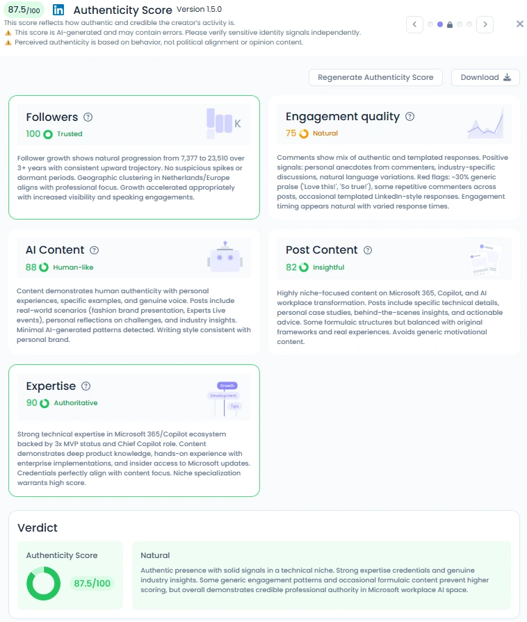 With an Favikon Authenticity Score of 87.5/100, Femke strikes the perfect balance between credibility and relatability. Her posts are filled with genuine moments, including thoughtful captions, personal milestones, and honest reflections on growth and leadership. Whether she’s celebrating her company’s MVPs or reflecting on career challenges, her voice stays consistent: confident, human, and deeply inspiring.