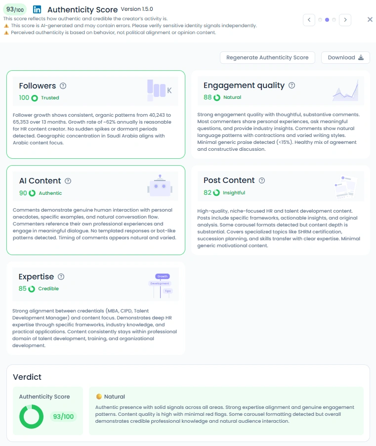 Favikon gives him a 93 out of 100 Authenticity Score. His engagement patterns look natural and professional. Comments show managers asking specific follow-ups and sharing outcomes from using his tools. He blends polished instructional carousels with candid commentary, which keeps his presence both authoritative and approachable.