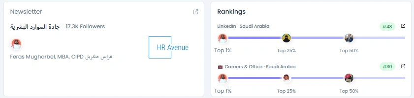 His followers jumped from about 40,200 to 65,300 in 13 months, signaling rapid organic growth in the Arabic HR audience. He ranks in the top 1 percent on LinkedIn Saudi Arabia and runs a newsletter with over 17,000 subscribers. Engagement quality is strong, with thoughtful comments and frequent shares of his templates. His posting rhythm centers on educational carousels and newsletter editions, which reliably generate discussion.