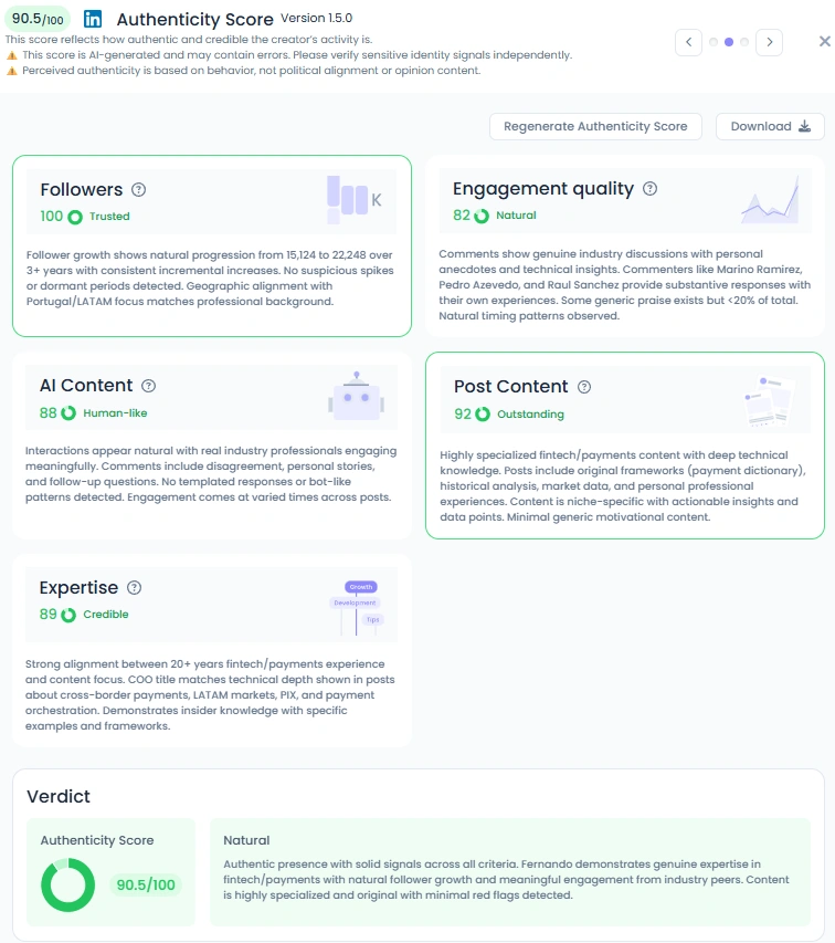 With an Favikon Authenticity Score of 90.5/100, Fernando’s presence on LinkedIn feels natural and authoritative. His posts balance expertise with personality, using approachable language to make fintech conversations human. Engagement on his content often includes in-depth comments from peers and industry professionals, adding layers of discussion that go beyond surface-level reactions. He does not post for visibility; he posts to create value, and it shows in every thread and article he publishes.
