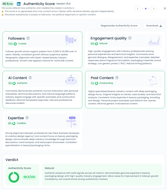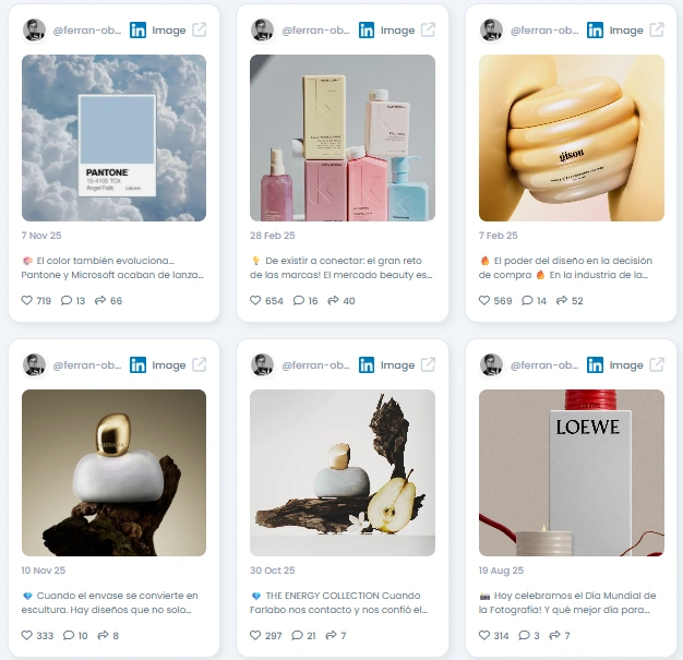 Ferran’s authenticity score is a stellar 96.5 out of 100. His audience clearly values what he shares. Comments on his posts come from professionals across packaging, design, fragrance, and retail. Discussions often involve constructive feedback, project sharing, and recognition of his collaborations.