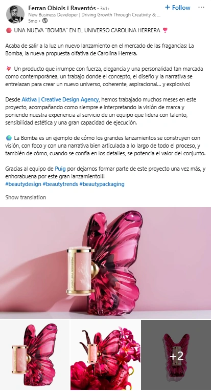 Ferran’s portfolio includes standout partnerships with Puig, L’Oréal, and creative agencies leading major fragrance and skincare launches. One notable collaboration featured the Carolina Herrera launch “La Bomba,” where he provided packaging insight and visual storytelling. His work is frequently tied to iconic campaigns and collections.