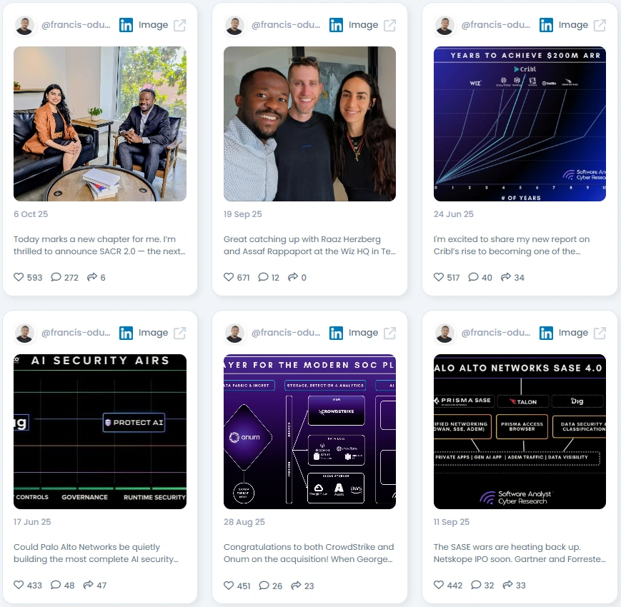 Francis’s collaborations extend across the cybersecurity and enterprise technology space. Through SACR, he has analyzed products and strategic moves from CrowdStrike, Palo Alto Networks, Onum, and Wiz, providing unbiased technical evaluations that have earned wide respect. He contributes research on topics such as AI in cybersecurity and the evolution of SOC platforms. These partnerships and insights have positioned him as both a researcher and an advisor to the next generation of security leaders.