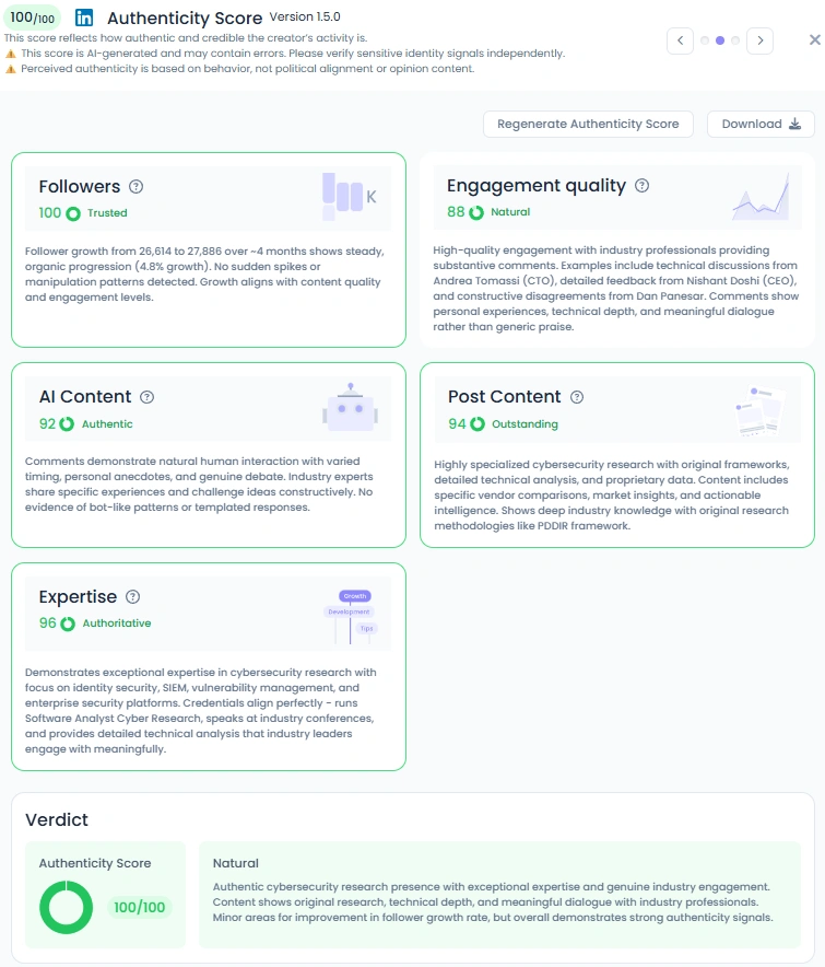 Francis holds a perfect Favikon Authenticity Score of 100/100, reflecting unmatched credibility in his field. His follower base grew from 26.9K to 27.8K naturally, with steady engagement and genuine professional interactions. With an AI Content score of 92 and a Post Content score of 94, his writing demonstrates authentic expertise with no trace of automation. His posts blend advanced technical language with human storytelling, from celebrating partnerships to acknowledging peers. That balance between authority and relatability is what makes Francis one of the most trusted cybersecurity creators online.