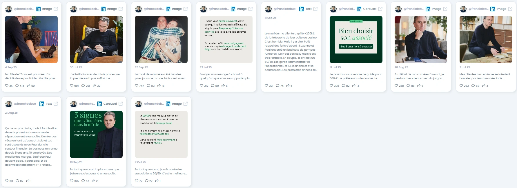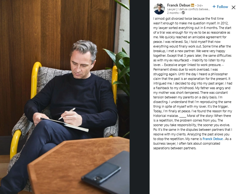 Franck is a Belgian business lawyer who chose a rare niche: partner and shareholder conflicts. After 20+ years in the trenches, he rebuilt his voice around stories, not statutes. He shares battle-tested playbooks on choosing an associate, avoiding the 50/50 trap, and what to write when emotions are hot. He lets you in on his own journey too, from early legalese that “lost clients” to a style that founders actually understand. The result is a profile that mixes casecraft, empathy, and blunt realism.