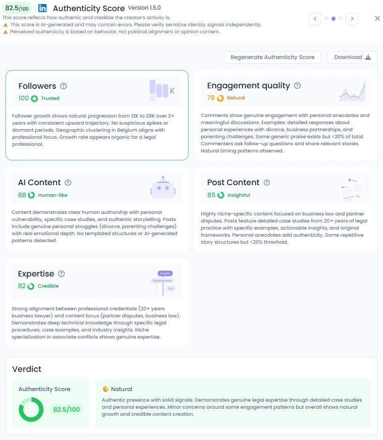 Favikon rates his authenticity at 82.5/100. You can feel why. He shares vulnerable moments (grief, divorce, parenting) to teach pattern recognition in conflicts. He answers real DMs, posts handwritten notes, and keeps the language human. Comments are full of founders adding their own experiences, not generic praise.