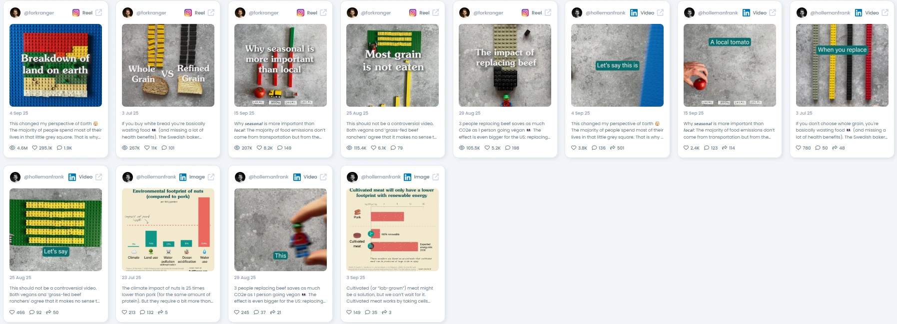 People follow Frank because he makes climate change personal. His communication style is visual, clear, and often playful, using Lego bricks and simple comparisons to explain complex sustainability issues. Followers know they’ll walk away with practical insights. These could include the carbon impact of beef or why seasonal food matters more than local. He doesn’t just inform, he empowers.