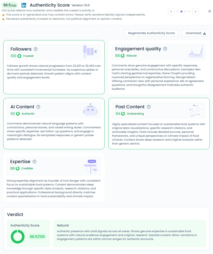 With an Authenticity Score of 98.5/100, Frank’s content speaks for itself. His posts are research-based yet human, backed with data but packaged in an approachable way. Comments often spark thoughtful debates, and he engages back with curiosity. Instead of generic motivational lines, Frank shares concrete frameworks and unique visual storytelling, which makes him stand out as both credible and relatable.
