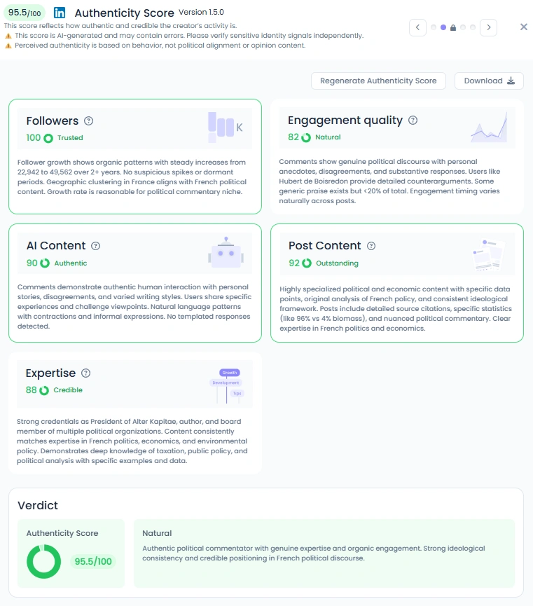 Favikon Authenticity Score: 95.5/100. Comments show real disagreements and thoughtful replies in natural French. Posts cite specific figures like tax shares or biomass percentages and link to original sources. You will find studio moments, radio mics, and quick behind-the-scenes shots that keep it human.