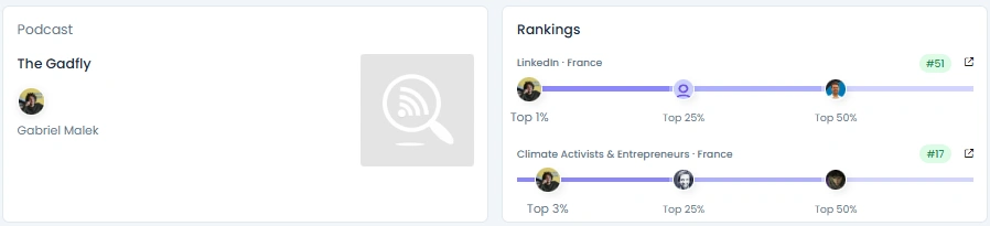 Influence Score: 7,845 pts. Followers grew organically from about 22.9k to 49.5k over two years with no suspicious spikes. Engagement quality sits at 82, post content 92, and expertise 88. He ranks #51 on LinkedIn in France and #17 among Climate Activists and Entrepreneurs in France. Posting rhythm is steady across LinkedIn, X, and podcast drops.
