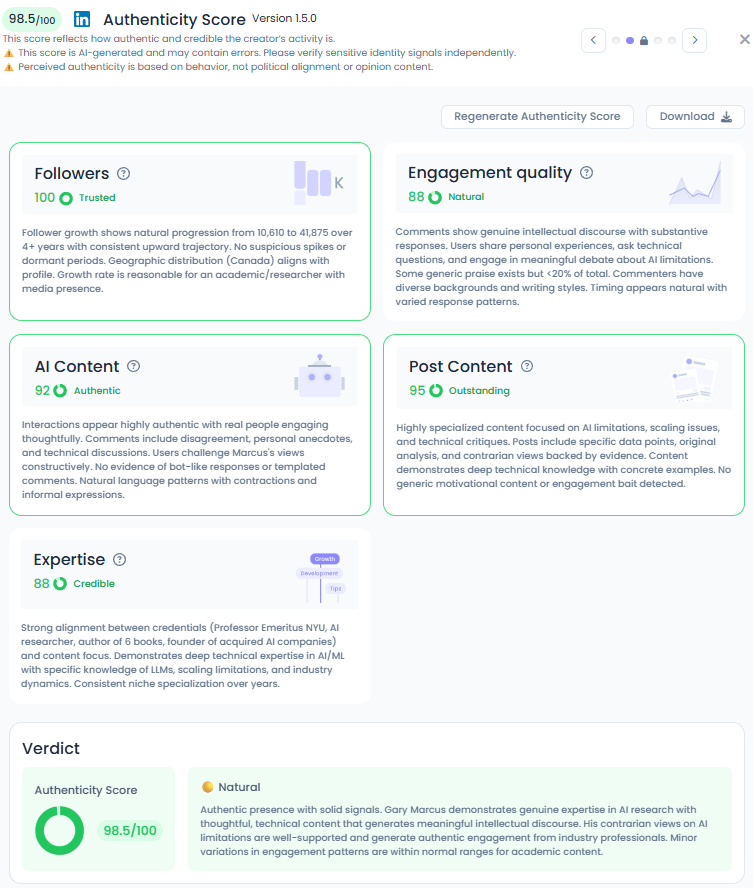 Favikon pegs his authenticity at 98.5/100. Comments read like a seminar room: challenges, counterexamples, and personal anecdotes from practitioners. Engagement quality sits at 88 with natural timing and varied voices. His content rates 95 Outstanding for substance and 92 Authentic for human authorship.