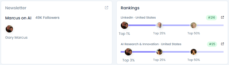 Gary’s LinkedIn audience grew from 10.6k to 41.9k over four years with steady upward curves. He holds an Influence Score 3 with 8,361 pts, and ranks #216 on LinkedIn US (Top 1%). In AI Research & Innovation (US), he is #25 (Top 3%). His “Marcus on AI” newsletter reaches 49k followers, sustaining deep-dive conversations beyond the feed.