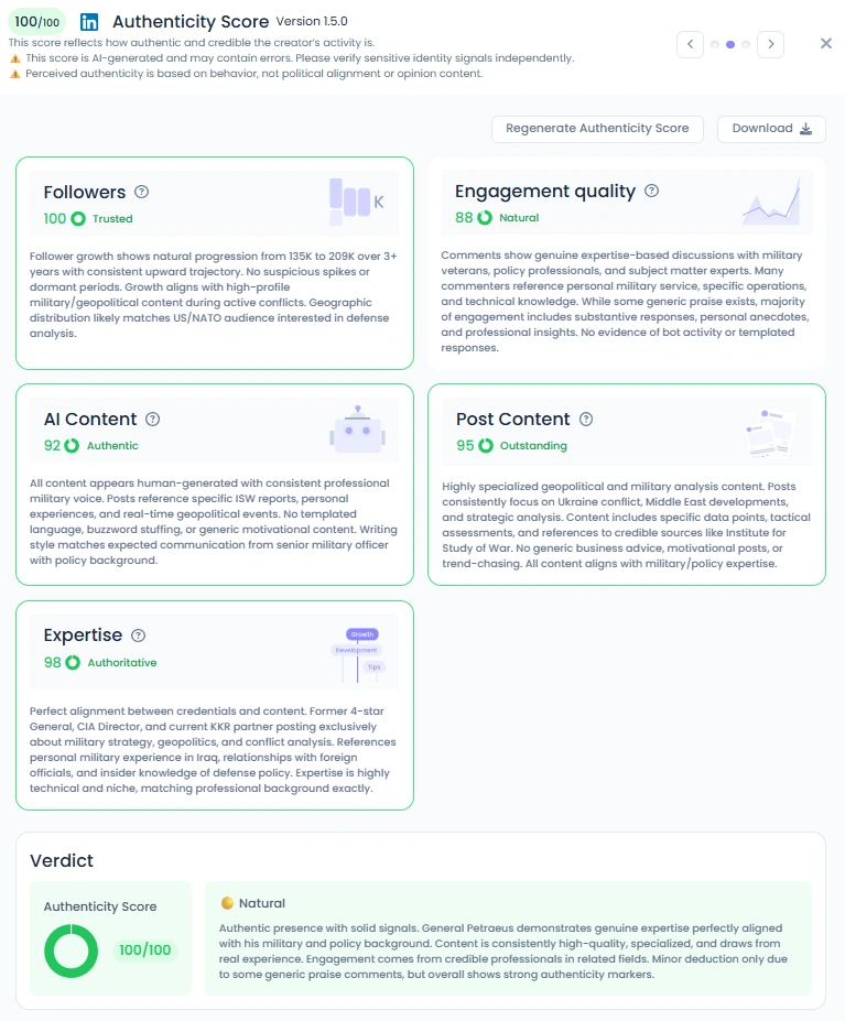 Favikon lists him at 100 out of 100 for authenticity. Comments come from veterans, diplomats, analysts, and industry leaders who add detail or push back. Timing and tone feel human. The voice is professional and consistent with a lifetime in command.