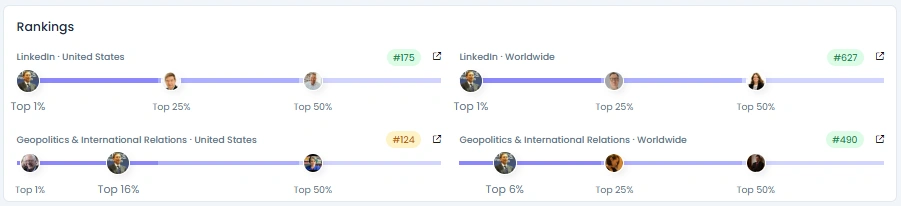 His audience rose from 135K to 209K followers across more than three years with steady growth. Quality signals include Engagement 88, AI content 92, Post content 95, and Expertise 98. Influence Score is 8,121 points. Rankings place him in the Top 1 percent on LinkedIn, with strong positions in Geopolitics and International Relations across the United States and worldwide.