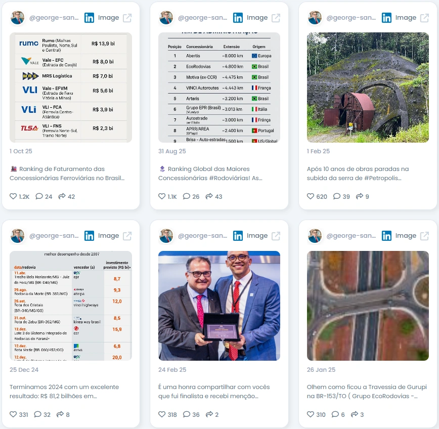 George Santoro has become one of the most active and respected voices in Brazil’s mobility and infrastructure space. He uses LinkedIn to break down complex transport projects with clarity, precision, and a tone that feels friendly even when the topic is serious.