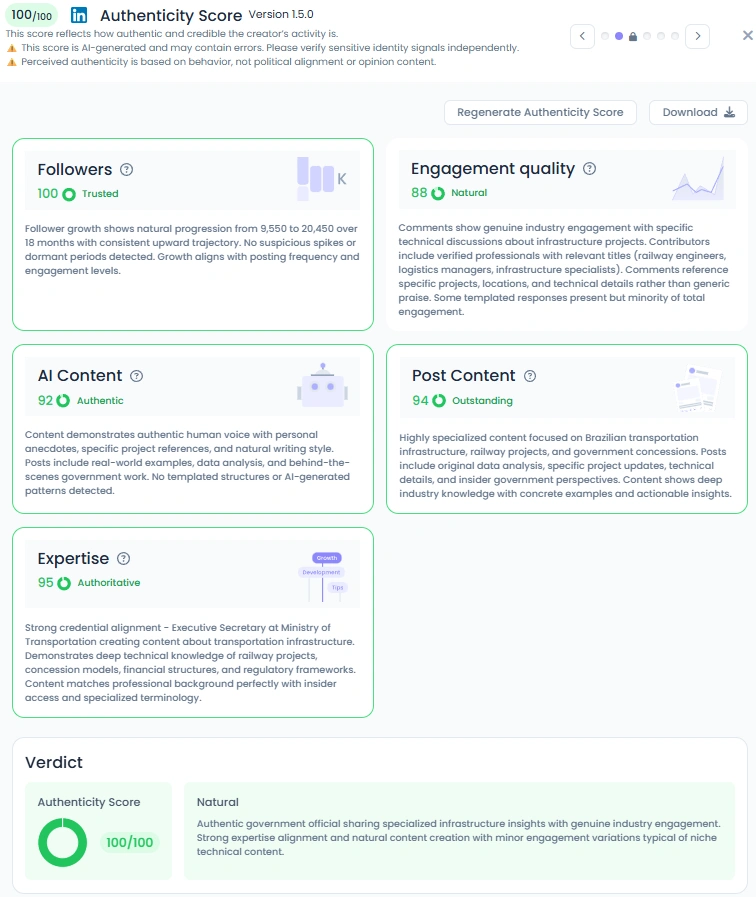 With a perfect 100 out of 100 Authenticity Score, George’s content feels unmistakably genuine. He shares real project updates, operational photos, and personal reflections from field visits. His comments include technical debates with professionals and constructive conversations with specialists. His writing uses natural Portuguese phrasing, supported by real numbers and data analysis. Nothing feels staged or templated. He communicates like someone who truly works on the ground.