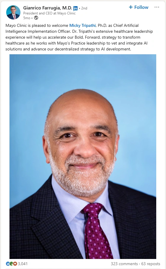 As President and CEO of Mayo Clinic, Dr. Gianrico Farrugia stands at the intersection of medicine, leadership, and innovation. His voice has become a benchmark for healthcare transformation, especially in the digital and AI-driven era.
