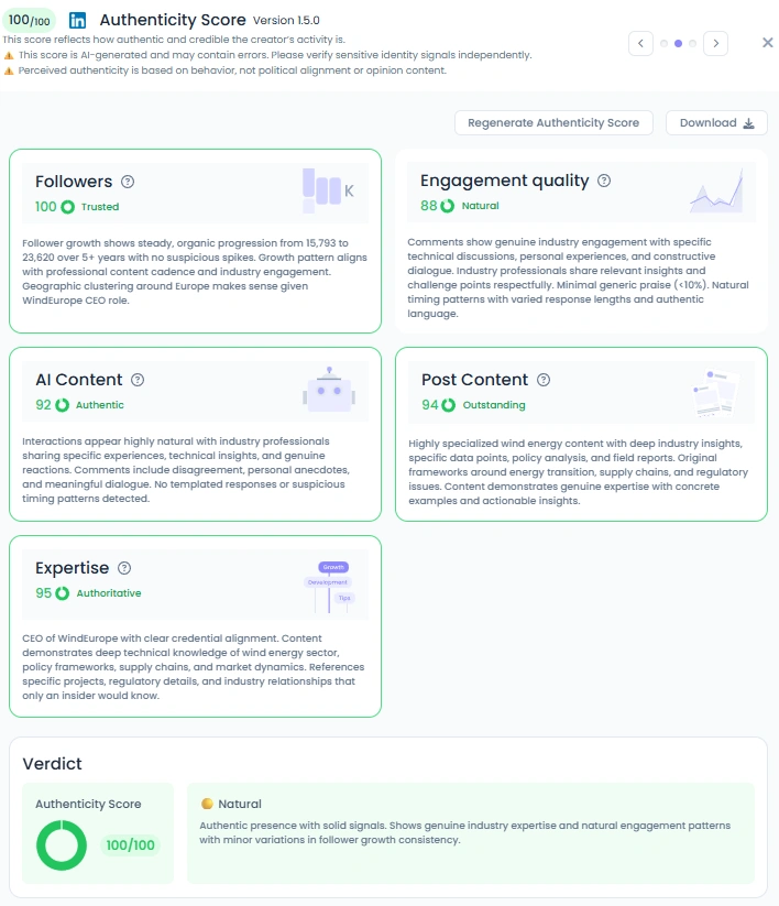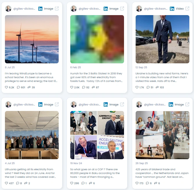 With a 100/100 Authenticity Score, Giles comes across as highly credible and consistent. His content shows real field visits, technical briefings, and industry dialogue. He posts images from wind farms and event halls, plus thoughtful summaries of policy outcomes. That mix signals both expertise and transparency.