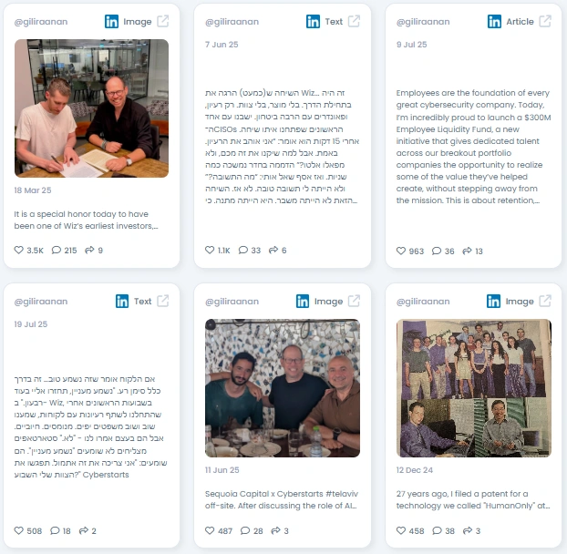 Gili’s audience grew from about 6,089 to 10,460 over the last few years, showing steady organic traction. His Influence Score is 8 with 4,394 points, placing him strongly in cybersecurity categories. Engagement quality is high, with frequent long-form comments and meaningful discussion on posts about product, hiring, and fundraising. He posts regularly and attracts attention from both founders and fellow investors.