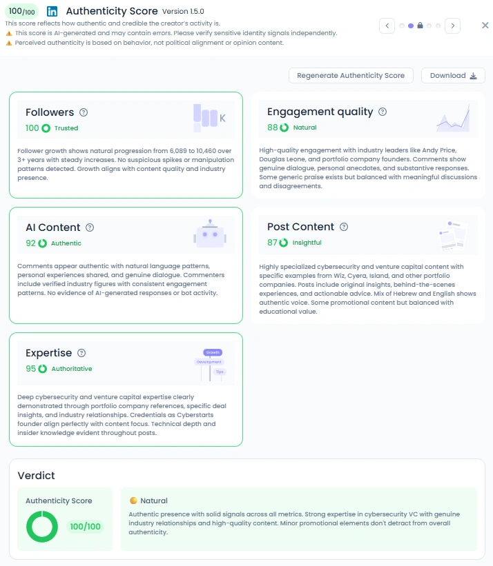 Gili’s Favikon Authenticity Score is a perfect 100/100, reflecting natural, high-quality signals across his activity. His feed balances original insights, candid photos, and community moments. Comments are substantive and come from verified industry peers. The overall pattern reads as genuine thought leadership rather than PR.