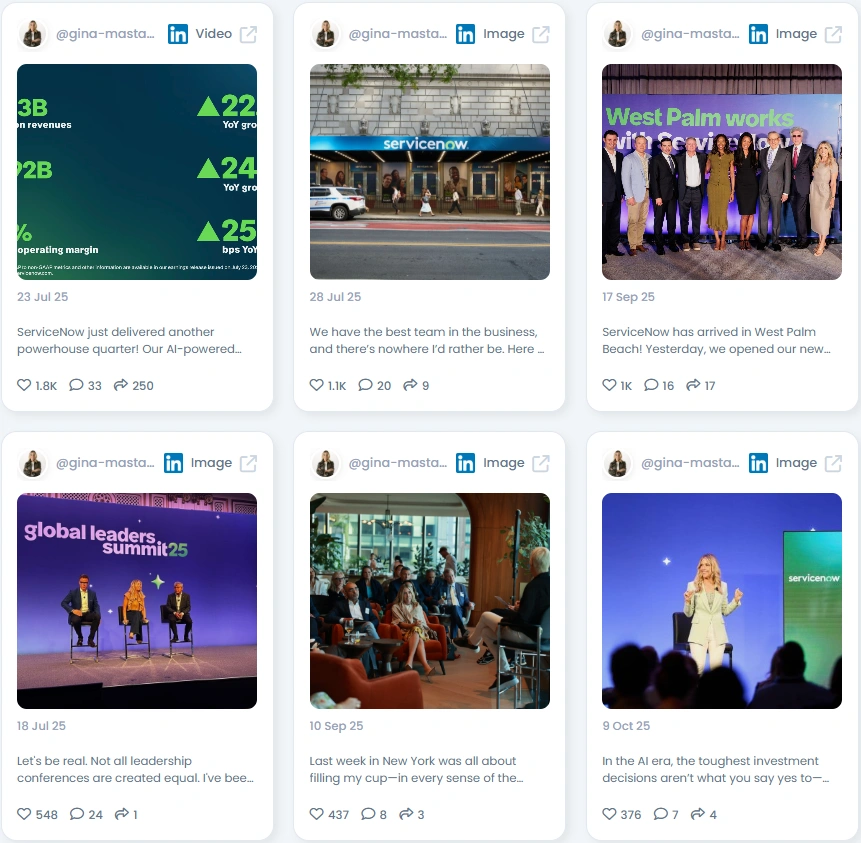 Her content features ServiceNow milestones, leadership events, and community initiatives. She partners with media stages like leadership summits to discuss AI investment choices and value creation. Office openings and customer gatherings bring local impact into the narrative. Every collaboration ladders back to execution and culture.