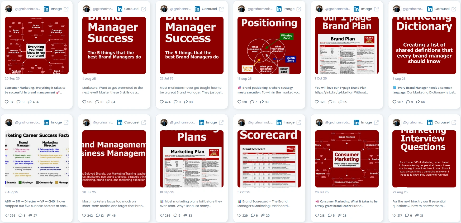 People follow Graham because his content is practical, visual, and refreshingly no-nonsense. He breaks down complex marketing ideas into digestible frameworks and real-world lessons. His signature red carousels turn brand theory into actionable advice, while his experience gives every post weight and context. Marketers trust him because he speaks their language, from junior brand managers to CMOs aiming to sharpen their strategy.