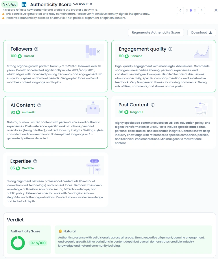 With a Favikon Authenticity Score of 97.5/100, Guilherme’s content stands out for its warmth and originality. His posts mix professional insights with personal perspective, from reflections on AI in education to moments of fatherhood that remind followers of the human side of innovation. Engagement on his posts is organic and meaningful, with comments filled with thoughtful discussion. His voice feels genuine, making complex education and tech topics relatable to a broad audience.