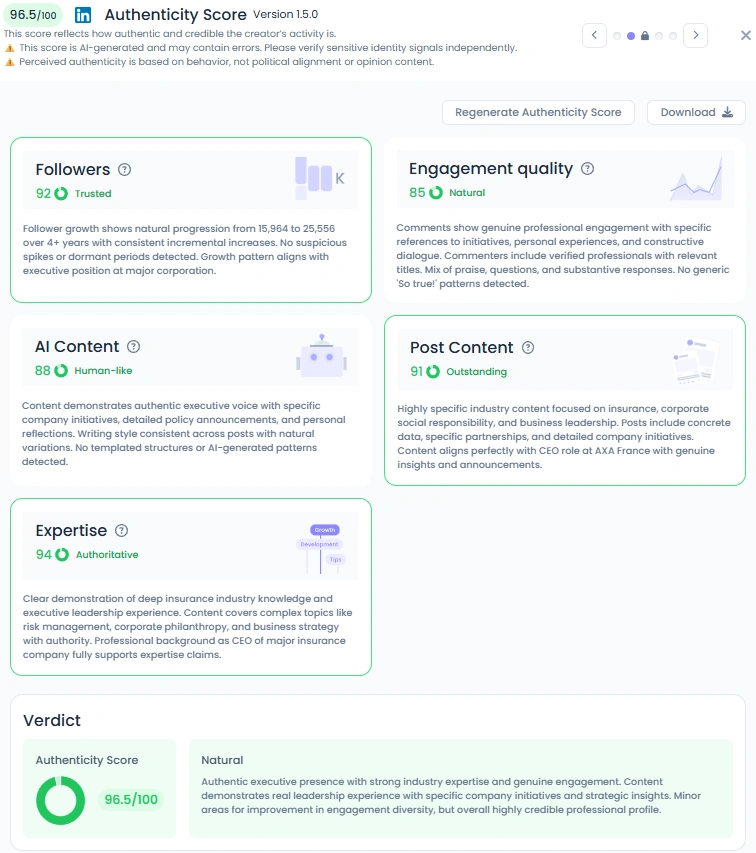 Guillaume has an excellent Authenticity Score of 96.5/100, with a verdict of Natural. His follower growth shows a natural progression over four years with incremental increases. Comments show strong professional engagement with references to personal experiences and constructive dialogue. He balances authority with relatability by sharing posts, for example, on supporting women's rugby or sharing personal thoughts on the "half-time of the year".