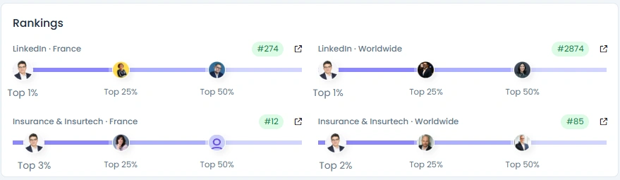 Guillaume Borie commands a significant platform with an Influence Score of 6,460 points. He maintains an audience of over 25.6K followers. His rankings are strong in France and globally, placing him in the Top 1% of LinkedIn worldwide. Within the Insurance & Insurtech niche, he ranks in the Top 3% in France and the Top 2% worldwide. His posting rhythm of 2 posts per month sustains a healthy Engagement Quality Score of 85 (Natural).