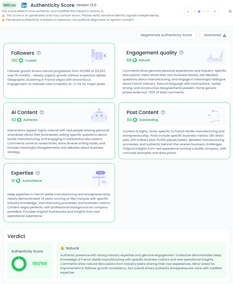 Guillaume holds a perfect Favikon Authenticity Score of 100/100, reflecting his transparency and credibility. His content includes real numbers, production details, and genuine stories from the factory floor. He regularly answers comments from entrepreneurs and small business owners, fostering open discussions about the realities of manufacturing. Nothing feels staged or overproduced. His voice is that of a leader who leads by example and shows his community what ethical entrepreneurship looks like in practice.